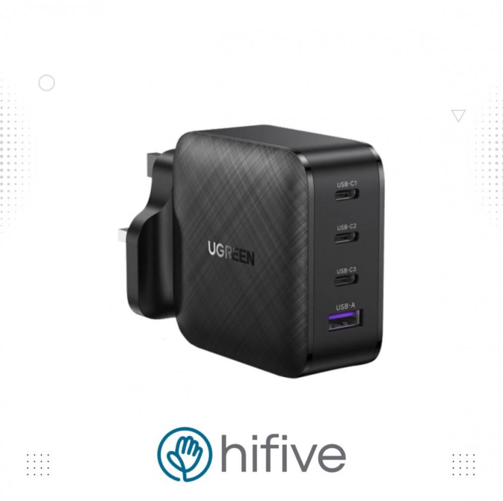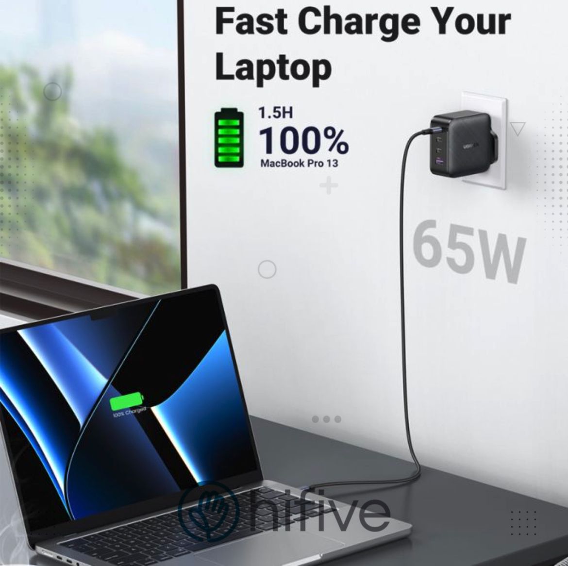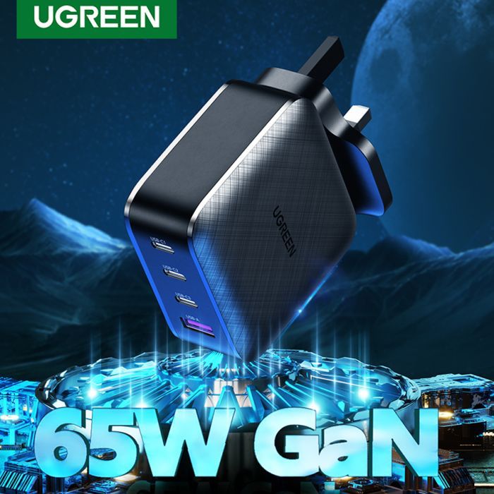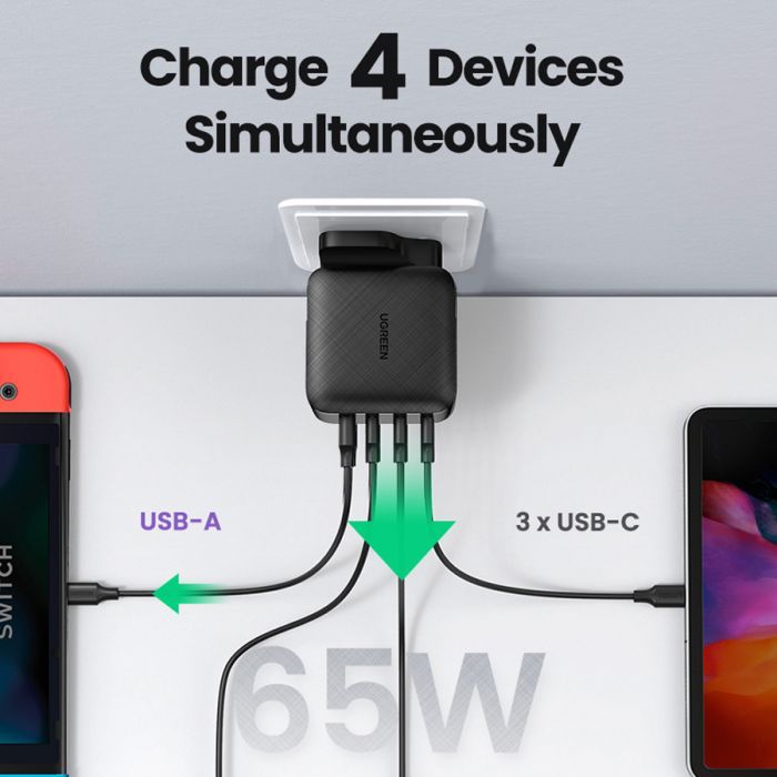 شاحن جداري يوجرين بثلاث منافذ PD وبمنفذ USB بتقنية GaN وبقوة 65 واط - رمادي