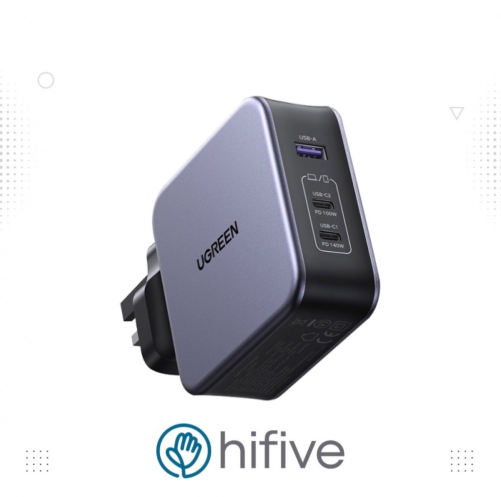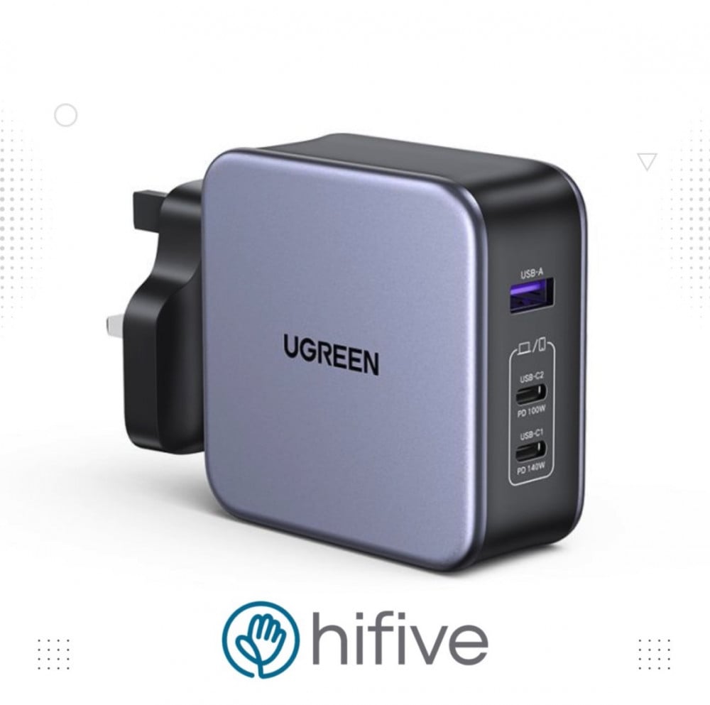 شاحن جداري يوجرين بمنفذين PD وبمنفذ USB بتقنية GaN وبقوة 140 واط - رمادي
